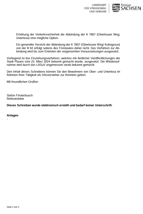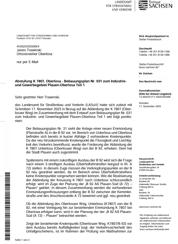 Informationen des LASuV an den OSR Oberlosa zur Abstufung K 7807, Oberlosa - Bebauungsplan Nr. 031 zum Industrie- und Gewerbegebiet Plauen-Oberlosa Teil 1