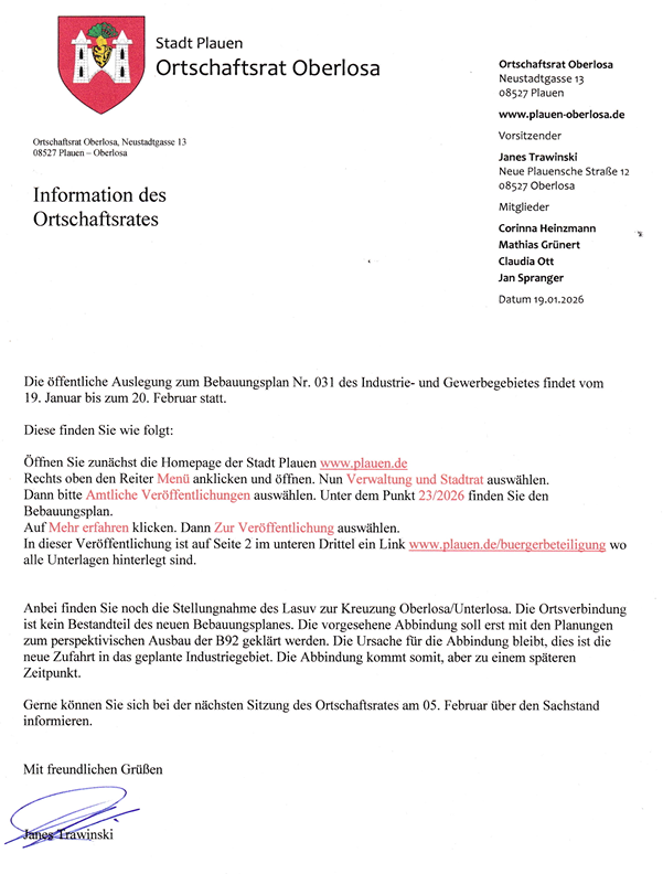 Aktuelle Informationen des OSR Oberlosa zur öffentlichen Auslegung des Bebauungsplanes Nr. 031