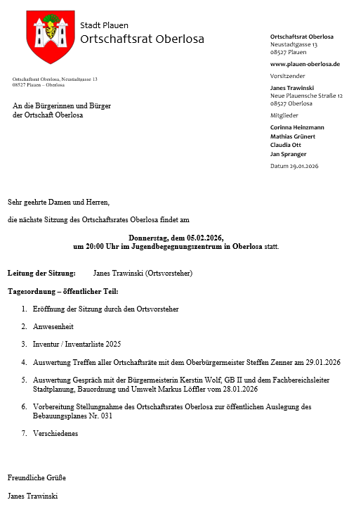 Die nächste Ortschaftsratssitzung findet am 5. Februar 2026 um 20:00 Uhr in der Neustadtgasse 13 statt.